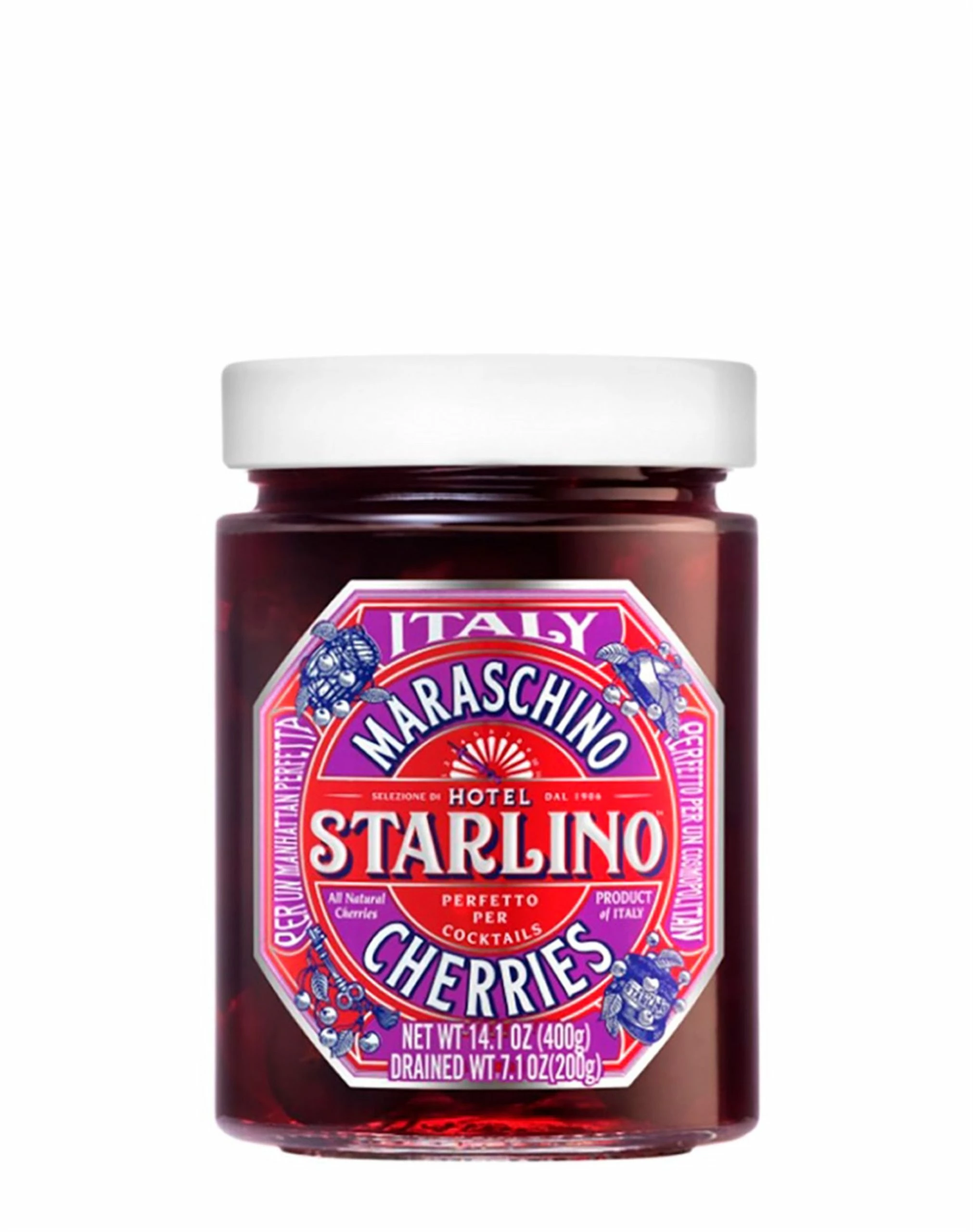 These Hotel Starlino cherries are all natural Maraschino cherries. For two weeks they have matured in their own Maraschino juice, where they then rest for another week to get the most delicious taste. The taste experience is a mixture of the sweet and the spicy. These berries are ideal for your drink, cocktail, risalamande or desserts.
