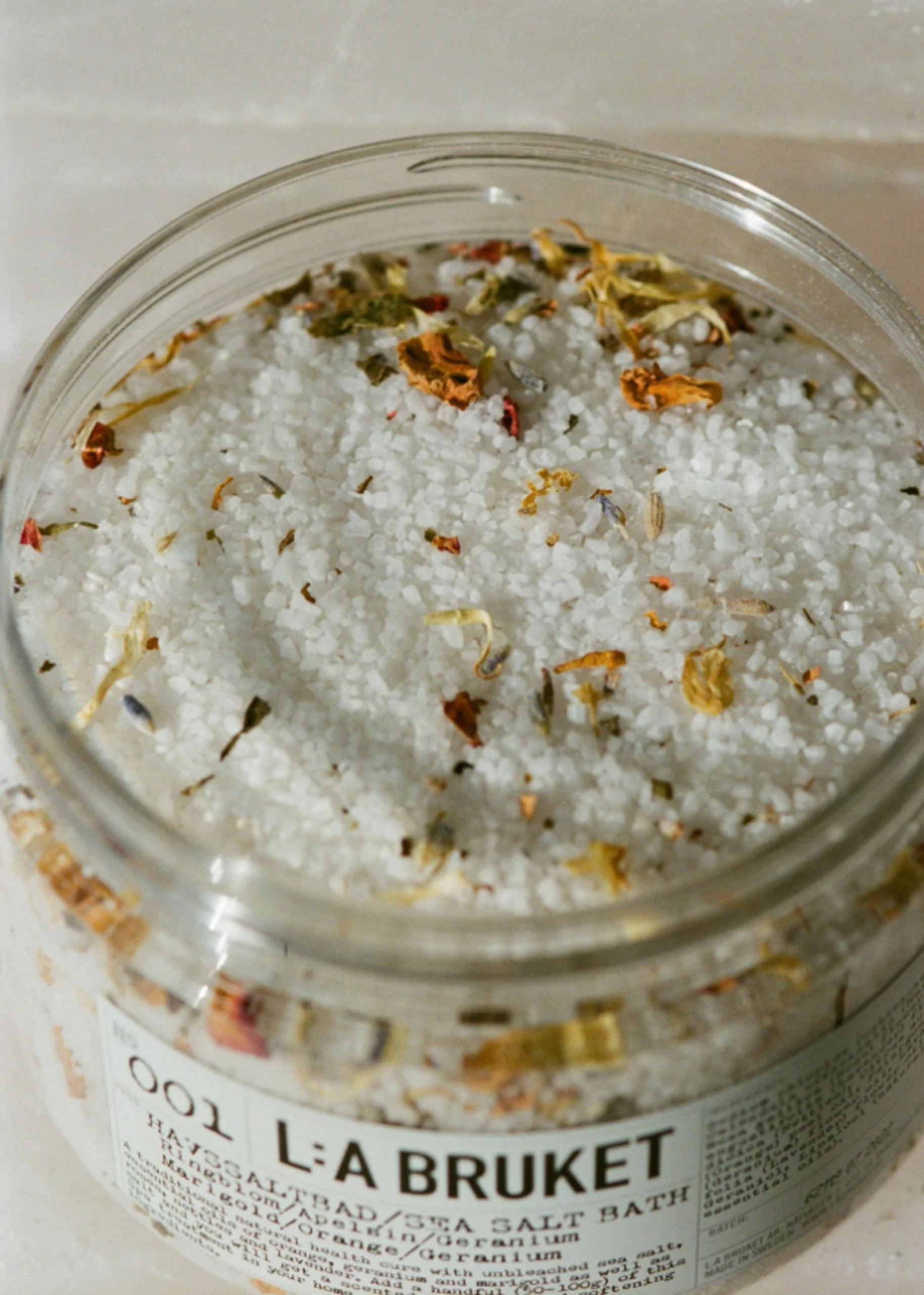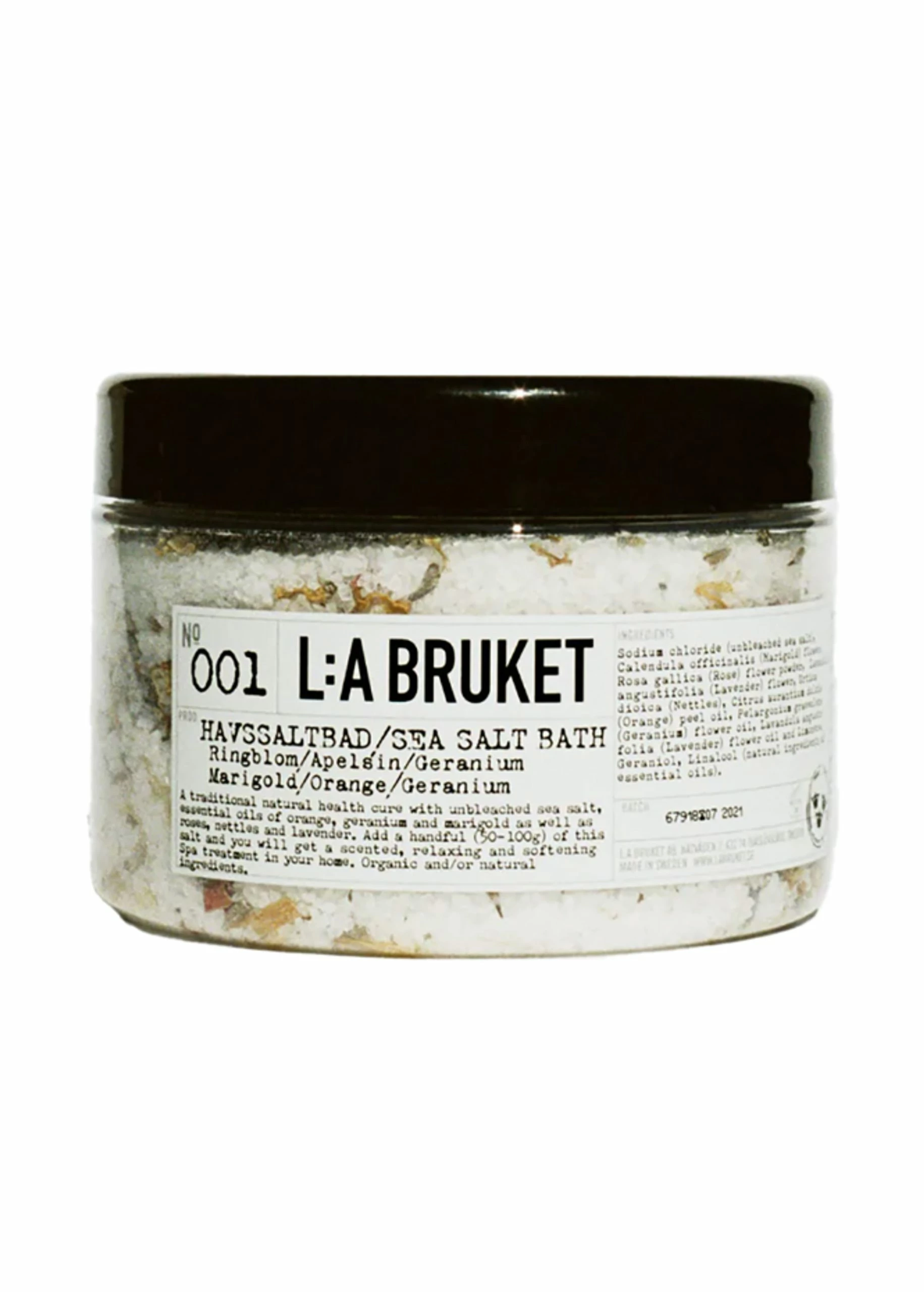 No. 001 bath salt from L:A Bruket is a bath salt rich in mineral nutrients. The bath salt has a balancing effect on the body, skin and emotions. The extracts of orange and geranium lift the mood by reducing feelings of sadness and stress. By taking a salt bath, the salt also helps to remove impurities from the skin and balance its moisture levels.