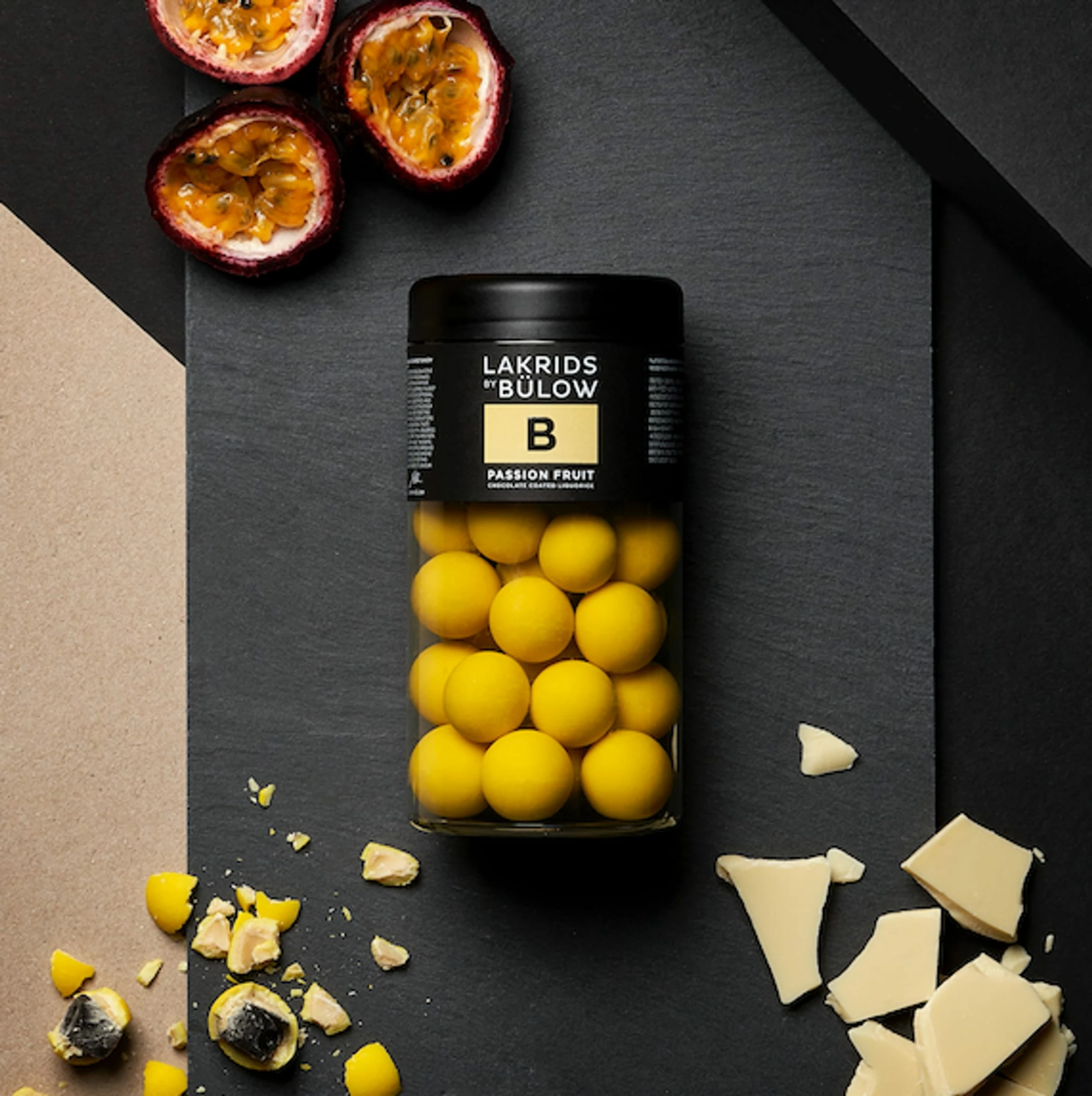 Sweet liquorice dressed in carefully selected white chocolate and passion fruit. The sweetness of the chocolate, the tartness of the passion fruit and the ability of the liquorice to unite the flavours make for the perfect mouthful. Sweet, tart and suave – enveloped in a delicate, crunchy sugar shell.
